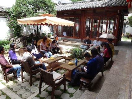 在古朴宽松和极具纳西特色的丽江益栈内,首届“丽江民间公益交流分享会”在这里举行,丽江益栈的老纳先生是这次活动的倡导者。分享会上在丽江从事公益事业的与会者们分享了各自从事公益事业以来的经验和体会,表示将对民族文化发展和丽江的生态保护投入更多关注。绿色家园的陈老师与参会者分享了中央文明办在丽江启动的全国山川河流保护项目内容,介绍了机构开展科学环保培训和垃圾不落地项目实施的经验。 欲了解更多信息请同时关注丽江绿色家园微博 http://weibo.com/ljgec或博客 www.blog.sina.com.cn/ljgec  会议主题宣传海报  分享会参会代表在热情交流 |