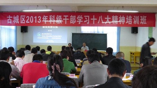 来自丽江市古城区党校的56名科级以上干部学员在区党校二楼会议室与绿色家园陈老师一起分享了 “坚持生态文明、建设美丽古城”主题讲座。学员们对新颖的讲座形式、贴切的讲座内容以及形象和深入浅出的科学环保知识表示了极大地兴趣,讲座受到了学员们一致的好评,也得到了讲座组织方古城区党校和教职员工的认可。