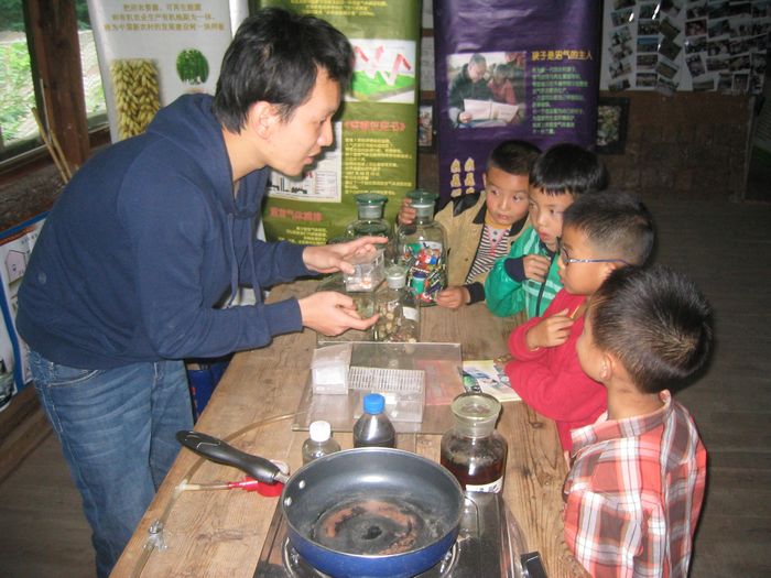 本周末,在结束了拉市海的旅游之后,4位妈妈带着4个孩子来到绿色教育中心开始了一段不寻常的低碳体验之旅。家长和孩子们随着中心老师的引导,从垃圾走进湿地,从鸟儿走进森林、从生态网走进食物链,从发电走进风能和太阳能,从马粪走进沼气池,从沼气厕所进到沼气厨房,孩子们处处感受到低碳之旅的神奇与魅力,最后,在老师手把手的教导下,孩子们不仅学会了沼气煎鸡蛋,还领悟了沼气低碳环保的要领。