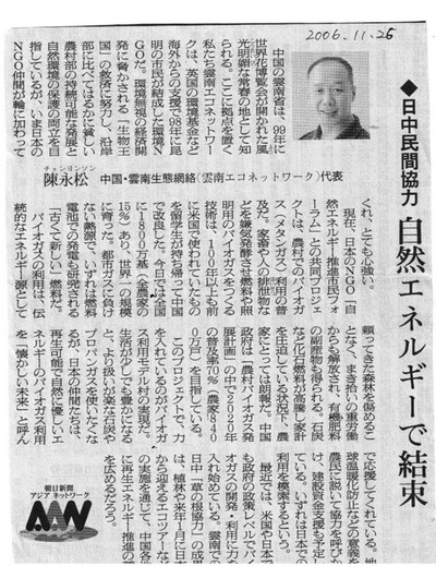 日本最大的新闻媒体“朝日新闻”在周日的“观点”栏目上刊登了云南生态网(YEN)与日本市民自然能源促进论坛(REPP)合作开展的“云南农村可再生能源推广项目”的报道。陈永松的照片被同时刊登在文章里。报道的题目是“中日民间联手共建沼气池,改善农村生活”。