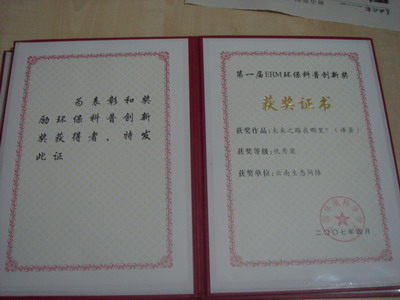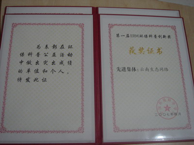 在浙江省杭州市召开的第二届全国环保科普工作经验交流会上,云南生态网一举荣获三个奖项,包括“先进集体”奖和译作“未来之路在哪里?”优秀奖,同时译作者生态网主任陈永松先生荣获个人优秀奖。云南生态网还荣获了第一届ERM环保科普创新奖。