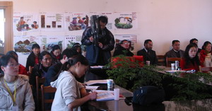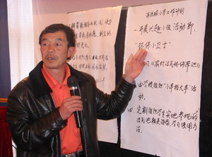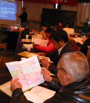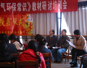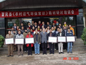 | 富民县《农村沼气环保常识》教材研讨培训会于2008年1月27~28日在昆明市富民县举行。会议由云南生态网主办。来自昆明市富民县、嵩明县和丽江市玉龙县的14所小学校的老师参加了这次教材研讨培训。本次活动还邀请了项目“沼农之家”的村民和大学生志愿者代表参加研讨培训。 经过两天的参与式方法讨论与教学,共完成了教材8个单元共19课的研讨培训。项目向14所学校的教师代表赠送了1600册《农村沼气环保常识》教材。 举办这次研讨培训会旨在通过农村地方教育部门和乡村教师参与开发地方性技术教材,共同探讨农村沼气环保教与学及其行动的步骤和方法,为进一步推广农村可再生能源应用,农村资源循环利用,节能减排和新农村建设作贡献。为此,共青团云南省委对此次活动给与了热情地支持和鼓励,并委派团省委学少部部长梁斌先生出席了颁发培训证书和向“沼农之家”代表授匾的仪式。  01 我们圆满完成了研讨和培训  02 研讨培训场面1  03 研讨培训场面2  04 比起老师来,我倒更像一个主持人  05 仔细阅读教材的学员  06 来自嵩明县的老师们正在小组讨论  07 一位老师正在展示他们小组的行动计划  08 电视台记者对教材颇有兴趣哟  09 轻松地研讨讨培训  10 绿字牌匾和红纸包装的教材相互辉映  11 在沼农之家授匾仪式上 |