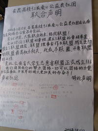 2008年3月15日和23日,云南省志愿者联盟组建会议在云南生态网办公室召开.联盟发起者是来自在昆高校的十三家爱心公益类社团的负责人。会议讨论了联盟的章程,并通过了联盟的章程草案。会议成立了联盟最高权力机关____联盟理事会。并且选举产生了联盟主席,会议全票通过了由云南生态网主任陈永松老师担任联盟主席的提议。各社团代表分别签署了加盟协议,以个人名义加入联盟的签署了个人加盟协议。 会后,发表了联盟联合声明,声明表示,联盟成员将尽自己的努力,团结一切可以团结的力量,为公益事业、为世界的明天更加美好而奋斗。 联盟成立还得到了团省委和云南生态网的大力支持。云南省志愿者联盟在社会各界的支持下,必将为公益事业做出贡献。 加盟邮件:office@yen.ngo.cn(撰稿:谭泽波)  组建会议上  13所社团关于联盟成立的联合声明 |