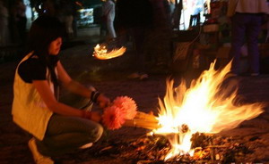 从农历六月二十四日起,纳西人按古规一连要过三天的火把节,点三个晚上的火把。每天门前要点一支柱子般又粗又大的大火把,寨子里的青年们个个拿着又细又长的小火把,沿着田埂、山路,边走边唱,直到深夜。火把燃得越旺,就越吉利,人们越高兴。(节选自