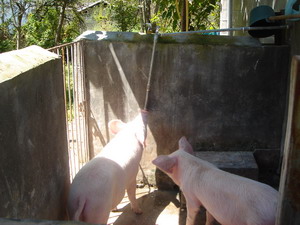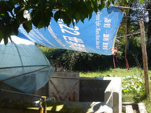 丽江太阳辐射较强,年均日照在2500小时以上。为了保温,根据能源部门的要求,家园的猪舍设计为大棚。已是秋高气爽的季节了,猪棚室外温度高达摄氏38度。在高温熏烤下,猪已经出现轻度中暑现象。我们采取的措施是搭遮阴蓬,给猪冲凉。