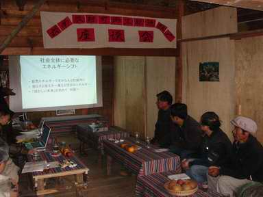 日本市民能源推进协会一行8人到云南进行为期9天的生态旅游。在云南期间,客人们游览了滇西北地区个别村子,看到农村普及太阳能、沼气等可再生能源后表示十分欣赏,并向农户了解使用沼气和太阳能的情况。考察团一行人应邀观摩了嵩明县小学开展的农村沼气环保教学。与日本学校学生对环保和公益事业不重视相比,客人们对中国农村从少年一代就重视可再生能源常识的教育与培训表示钦佩。  参观安宁能源生态村  了解农村学校应用太阳能情况  参观太阳能热水器生产厂  邵九小学同学中午在集中热饭  在香格里拉参观农户沼气池  一客人对安宁农村开展的沼气售后服务表示赞赏  客人们看到废弃的沼气池感到惋惜  云南农村可再生能源推广座谈会在能环家园举行  能环家园的英语教室也非常适于召开座谈会  客人介绍日本开展可再生能源推广情况  一株树志愿者联盟副主席谭泽波向日本客人介绍沼农之家情况 |