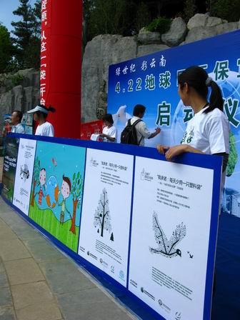 4月19日,云南生态网携手一株树志愿者联盟于昆明市莲花池公园内举行4.22地球日“绿世纪,彩云南”系列宣传活动启动仪式。 出席启动仪式的有共青团云南省委、省宣教中心领导、省绿色环境发展基金会官员、企业代表、社区居民代表和来自昆明市14所高校的大学生志愿者。 本次活动启动仪式上,昆明市委书记仇和委托昆明市委宣传部张红苹部长到会给全体参会人员转达了昆明市委、市政府对公众参与公益环保活动的鼓励和支持。(雨欢报道、刘轶摄影)  跟妈妈一起走进环保的世界  展开地球日活动主题  张部长代表仇和书记鼓励环保志愿者  展板内容吸引了参加活动的人们  拎着废旧物品换环保绿叶布袋的老人  我也有一个环保布袋了  影响  一名不“塑”之客的承诺  志愿者联盟全家福 |