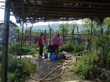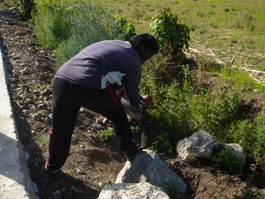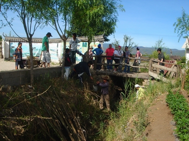 村民协助在沟边取淤泥做种树的底肥