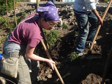 一美国学生在仔细地回填土