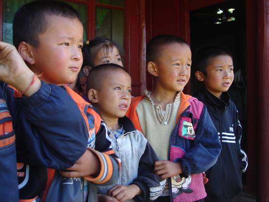 孩子们在认真听美国大学生说英语