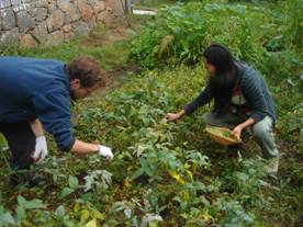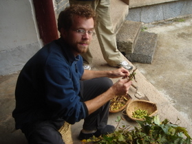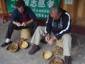 | 我们很多人喝了多年豆浆,却很少看到豆浆是如何制成的。在家园学习的美国学者大卫森在中国期间十分喜欢喝豆浆,今天他终于在家园学会了制作豆浆,并且是从地里的摘豆开始。请看大卫森的豆浆生产小结: 新鲜的农户豆浆 Farm fresh soy milk 大卫森,2009年9月26日 Michael, Sept 26, 2009 我们天天喝的豆浆究竟是怎么来的?包装的,要么在一大桶开水掺入豆浆粉,那就是我在北京喝的豆浆,除了是用黄豆做的,不知更深。到了云南农村我可以看到整个过程,也最后能喝到一辈子最新鲜的豆浆! Where does the soy milk that we drink everyday come from? Packaged, or perhaps soy milk powder mixed in a vat of hot water, that’s the soy milk I drank in Beijing, and except for the fact that it’s made from soy beans, I didn’t know anything else. Arriving in rural Yunnan I was able to see the whole process, and finally to drink the freshest soy milk of my life!  1. 首先,要把黄豆杆摆下来。 First, collect the soy bean stems.