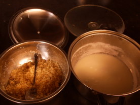After blending, extract the liquid (right) and boil; the left-over bean residue has a lot of uses. We made some dumplings here. As soon as it boils the soy milk has a powerful aroma; put in a little sugar and it’s ready to drink.  整个过程的示意图: The whole process: