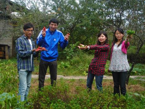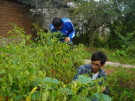 云南省一株树志愿者联盟副主席卡提怕同学带领的来自中央民族大学和四川大学的同学们利用国庆长假到丽江旅游的机会,顺路来到绿色家园参观学习,动手为沼气池拾粪,亲手采摘家园绿色蔬菜—辣椒和薄荷,实实在在地体验了一把家园的绿色生活。