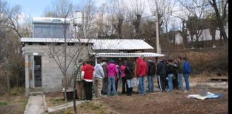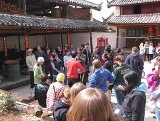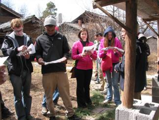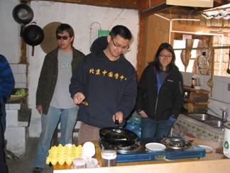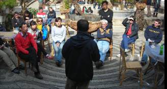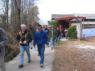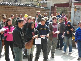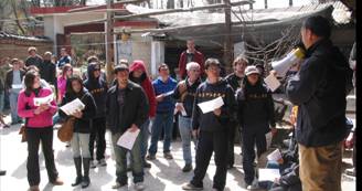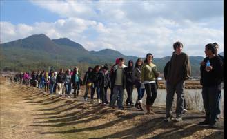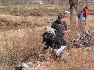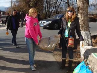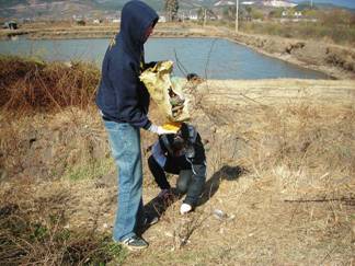 两名女大学生抬着捡拾的垃圾穿过丽-香公路