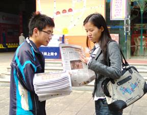 2010年3月28日上午,在昆15所高校的千余名大学生志愿者,参加了由云南生态网一株树志愿者联盟与云南信息报共同开展的“一份报一元钱、一瓶水一份情”的抗旱救灾义卖活动。志愿者们在昆明市繁花的南屏街口、世博园门口等6个热闹场所义卖了8000份《云南信息报》,全部善款满载大学生志愿者的拳拳之心将用于购买瓶装饮用水送往旱灾区。 (图文:云南省一株树志愿者联盟)  云大滇池学院唤青社的志愿者在南屏街义卖报纸  冶金高校萌青社和昆工环协的志愿者莲花池义卖报纸  财大公管学院青协和绿风环协的志愿者在月牙塘公园义卖报纸 |