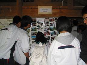 同学们参观展厅仔细阅读展板英文说明 一群同学在“靓影园地前驻足观赏