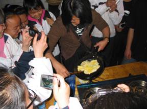 绿色家园科普讲解员在向学生们解说沼气灶使用要领 一名女生在一旁用相机全程拍摄自己老师用沼气煎鸡蛋的实况