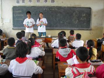 2010年9月8日,参与过“低碳乡村教育”培训的6位大学生志愿者来到拉市乡的吉余完小协助本校教师开展教材的教学。由于初次走上小学讲台部分志愿者略显紧张:课堂上采用参与互动的教学模式使得师生从紧张的状态中逐渐放松,课堂活跃气氛融洽,师生们可以一起讨论,互动学习沼气的知识。