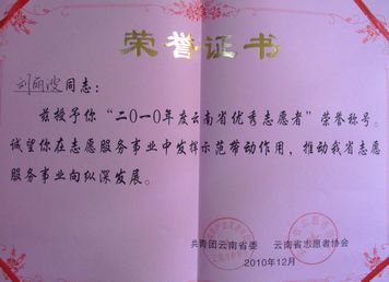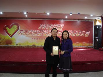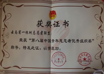 12月22日,2010年度云南省志愿者工作总结暨表彰大会在昆召开。一株树志愿者联盟派理事成员和曦(丽江市环境保护志愿者协会会长)参与了此次会议并代表联盟领取了由共青团中央和中国青年志愿者协会颁发的“第八届中国青年志愿者优秀组织奖”证书及奖牌。同时和曦本人获得第八届中国青年志愿者优秀个人奖,联盟秘书长刘俪波老师获得云南省优秀志愿者称号。