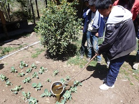 学习沼肥知识后,一名同学亲自动手给蔬菜浇沼肥
