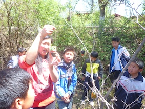 家园科技辅导员在向同学们展示沼肥盆栽植物