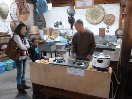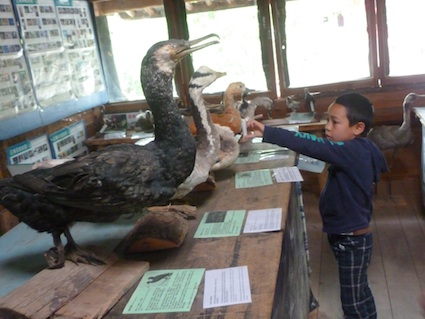 由于姐姐星期天要补习,爸爸妈妈只好带着刚上一年级的儿子来到距束河古镇12公里以外的拉市海绿色家园参观。家园的老师用中文讲解展厅内容,爸爸有时用中文、有时用英文给孩子做说明。
