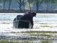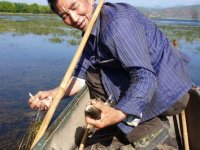 二、出海 尽管住在拉市海海东的绿色家园,距水边不到800米,可是我却没有太多机会下海,因此,对捕鱼和海水的情况了解不多。和一些关心拉市海水质的人一样,我时常也会莫名担忧,担心这个被称为“丽江古城备用水源”的拉市海海水被污染拖累。当我们随着木易爷爷径直走到海边,坐上渔船向长满水草的深海撑过去时,发现船边的海水和浪花除了散发着那种特有浓郁的水草味以外,水深清澈见底;当海水深到约3米时,海水颜色由绿色变成了深蓝色。掬一把水抹一把脸,顿时滑过一阵清凉,好不醉人。