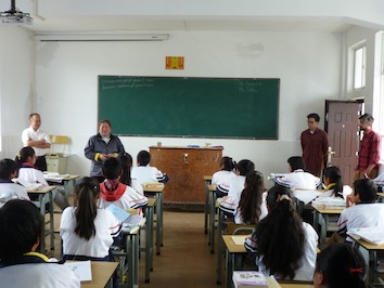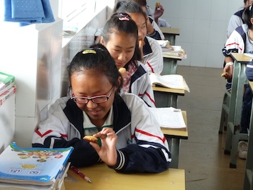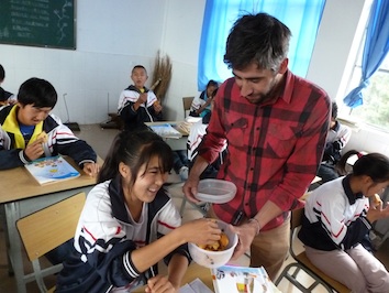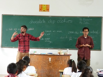 “长亭外,古道边,芳草碧连天……”玉龙二中100班的教室里响起了离别的歌声,这是家园的两位实习生叶孝凯和冷博登在100班的最后一节英语课。两位美国实习生在家园老师的安排下,每周给玉龙二中96班和100班的学生上一节英语口语课。从陌生到熟悉,从羞涩到热情,从无法开口到喜欢说英语,乡村学生只能用这首歌来表达他们对两位实习生的难舍之情。  在课堂上的美国实习生