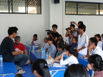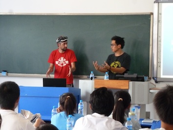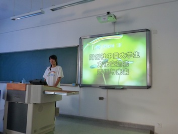 同创社的同学宣布活动开始在云南生态网丽江绿色家园支持下,由一株树志愿者联盟主办、云南师范大学同创社承办的主题为“责任与未来” 的中美大学生文化交流活动顺利落下帷幕。交流活动中的两位主讲嘉宾是来自丽江绿色教育中心的美国实习生。他们在有5所高校社团代表参加的交流会上分别介绍了他们在丽江实习的情况,分享了他们的心得和体会。交流活动气氛热烈,问答此起彼伏。尽管活动已经结束,同学们在校园内继续交谈,又是一个半小时过去了,大家才依依不舍相互道别。
