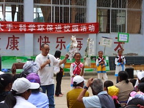 “这位同学,请停止砍树!”培训现场传来了主讲人陈永松老师铿锵有力的声音,拿着砍刀的学生低着头走到陈老师身边。原来,绿色家园通过表演互动的方式来讲解什么是公共意识。随后,垃圾生财富、马粪变沼气等精彩的科学环保知识宣讲获得观众阵阵掌声和欢呼声。