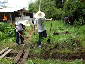 一名同创社社员在整理辣椒地 两名男生在疏通菜地灌渠