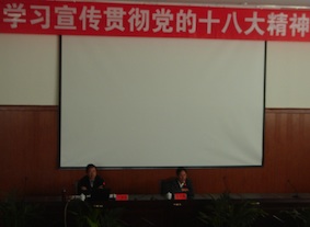 丽江共青团学习宣传贯彻党的十八大精神专题报告会今天在丽江市委党校顺利召开。尹钟瑞老师向出席报告会的团干部阐释了学习宣传贯彻党的十八大精神的意义,解读了全面准确学习领会党的十八大精神的方法。共青团丽江市委余书记向本市广大团干部提出认真学习宣传和贯彻党的十八大精神的要求和期望。
