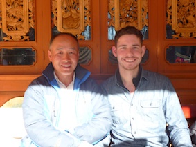 2009年暑期,凯文先生从遥远的美国西雅图大学来到绿色家园实习,实习期间,他和同期实习的其他美国学生帮助绿色家园设计展厅垃圾分类展,将展厅所有展品翻译成英文;他积极参与组织2009拉市海绿色夏令营活动,关注农村可持续生计等。回国后,他在西雅图大学积极宣传中国农村普及推广的可再生能源,积极推进中美环境文化交流。2012年末,他与同事一起回到了他热爱的丽江,再次走进他曾经学习和生活过的绿色家园,看到眼前熟悉的一切他百感交集,流连忘返,他根据自己的工作经验,为绿色家园支招,并告诉绿色家园的指导老师,他会应用他从事的社会媒体平台,为绿色家园牵线搭桥。 凯文和他的指导老师在绿色家园  凯文抚摸着自己翻译的展品解说百感交集,犹如见到老朋友一般 |