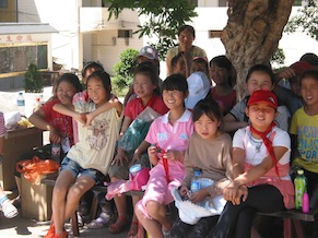 为避免烈日暴晒,培训在校园的车棚内  老师与好奇的同学们在一起