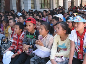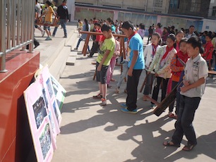 在烈日下听讲座的同学  抬着凳子观看展板的同学