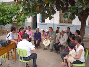 坐在教学楼遮荫处听课的师生们  这位同学显示出对培训的好奇