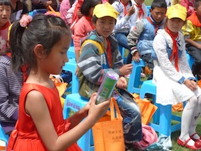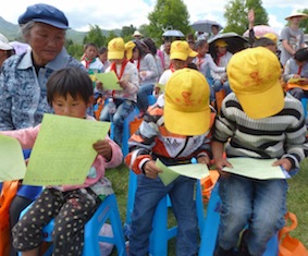 孩子们认真阅读保护拉市海湿地宣传资料
